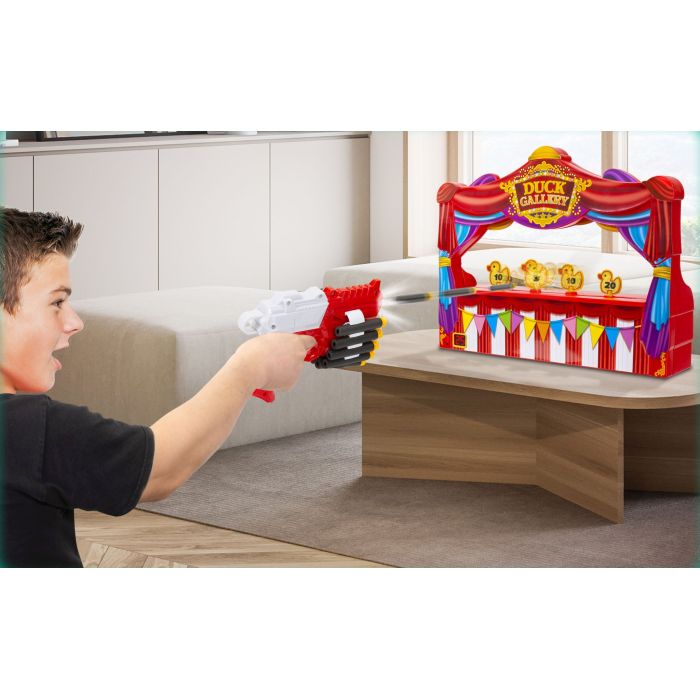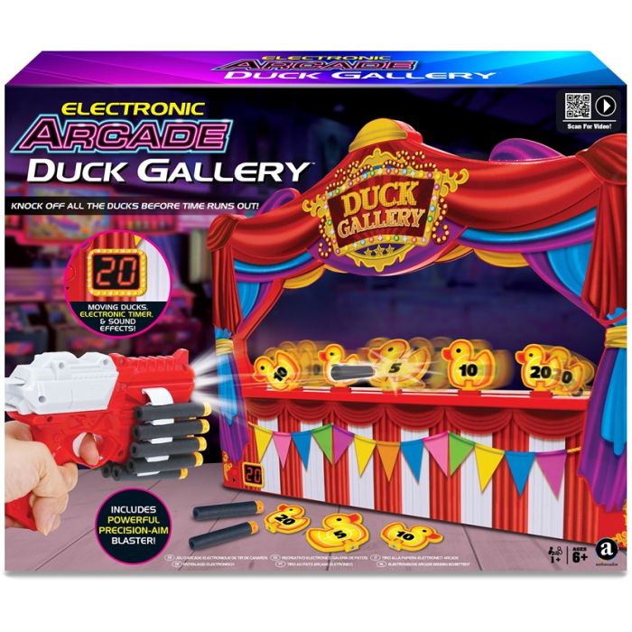 Προχωρήστε αμέσως, προχωρήστε αμέσως! Όλοι είναι νικητές σε αυτή τη διασκεδαστική και συναρπαστική εκδοχή του κλασικού παιχνιδιού σκοποβολής πάπιας! Ο στόχος είναι να ρίξετε όσες περισσότερες πάπιες μπορείτε σε 60 δευτερόλεπτα. Κάθε πάπια περιστρέφεται γύρω από τη σκηνή κατά μήκος του κινούμενου ιμάντα μεταφοράς, αυξάνοντας την πρόκληση. Οι πάπιες υπάρχουν επίσης σε 3 μεγέθη, το καθένα με διαφορετική αξία πόντων, οπότε σημαδέψτε προσεκτικά τις μικρότερες για να αυξήσετε το σκορ σας! Η μουσική και οι ήχοι από το κροτάλισμα της πάπιας προσθέτουν ατμόσφαιρα, ενώ το φωτεινό χρονόμετρο LED σας ενημερώνει για τον χρόνο που απομένει. Μόλις τελειώσετε, μαζέψτε τις πάπιες και υπολογίστε το σκορ σας. Αντικαταστήστε τις πάπιες στον ιμάντα και είστε έτοιμοι να παίξετε ξανά - όλοι μπορούν να προσπαθούν εναλλάξ να καταρρίψουν ένα νέο ρεκόρ! Έρχεται έτοιμο για παιχνίδι με εκτοξευτήρα και βελάκια. Για 1 ή περισσότερους παίκτες. Απαιτεί 3 x μπαταρίες AA (δεν περιλαμβάνονται). Συνιστάται για ηλικίες 6 ετών και άνω. Διαστάσεις προίόντος: 7,6 (Π) x 32 (Υ) x 42 (Μ) cm.