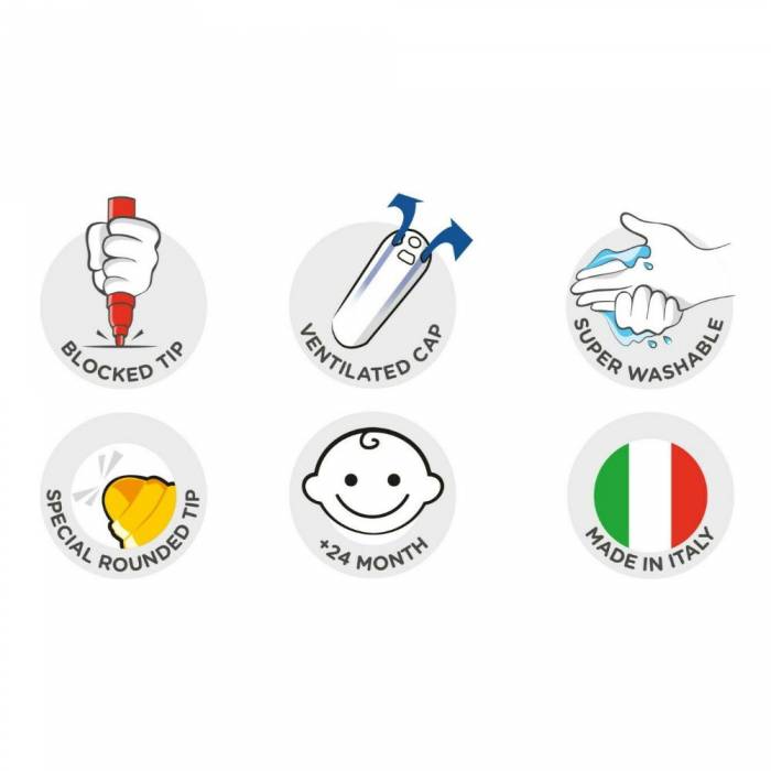 Μαρκαδόροι Baby Carioca 8τεμ. και 2 puzzle υψηλής ποιότητας ειδικά σχεδιασμένοι για νήπια. Το σχήμα και το μέγεθος τους επιτρέπουν εύκολη και σωστή χρήση. Η μύτη είναι στρογγυλεμένη για μέγιστη ασφάλεια και μεγαλύτερη για να καλύπτει μεγάλες επιφάνειες γρήγορα και χωρίς κόπο. Το μελάνι καθαρίζεται εύκολα μόνο με νερό και χρησιμοποιούνται χρωστικές ουσίες φαγητών μόνο. Χωρίς κανένα κίνδυνο και απόλυτα ασφαλείς. Δερματολογικά ελεγμένο.