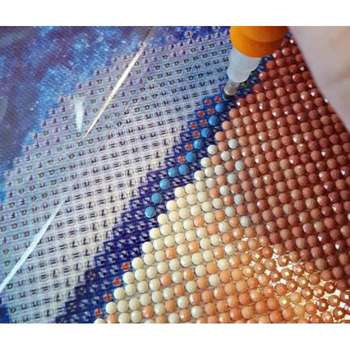 ΣΗΜΕΙΩΣΗ: Βυθίστε τον συλλέκτη διαμαντιών στο κερί. Αφαιρέστε την προστατευτική μεμβράνη από το μοτίβο και, στη συνέχεια, τοποθετήστε τα διαμαντάκια, το ένα μετά το άλλο, στο κατάλληλα σημειωμένο κολλώδες σημείο τυπωμένο στη βάση με το σχέδιο.