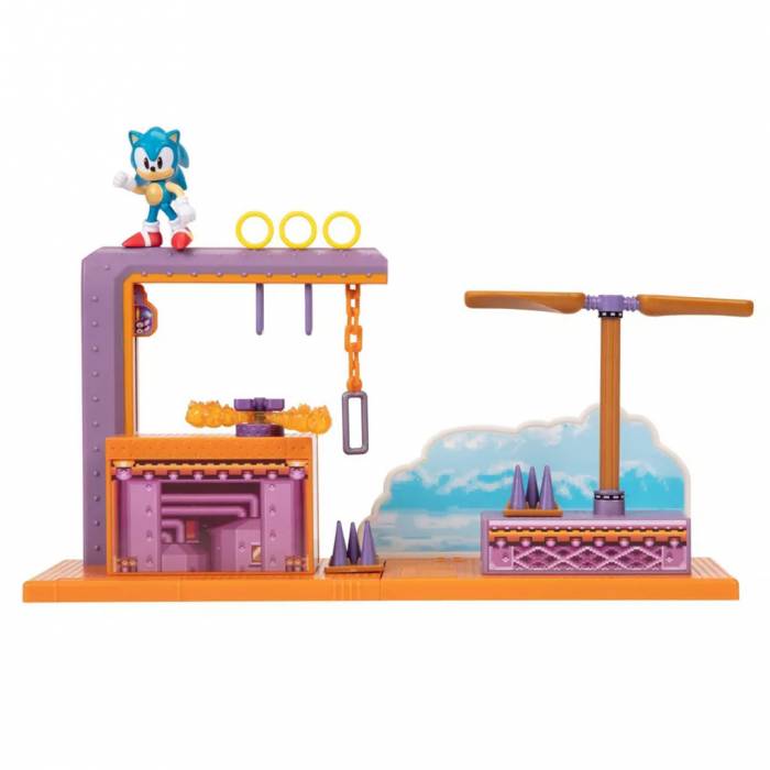 Included in the set is a two and half inch scale Sonic figure and environment pieces with working mechanisms.