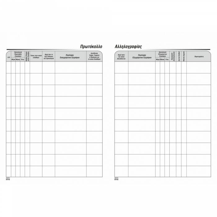 Διαθέτει 7 στήλες που αναγράφονται ο αύξων αριθμός, ημερομηνία, αριθμός, προέλευση, περίληψη εγγράφου, υπογραφή παραλήπτη.