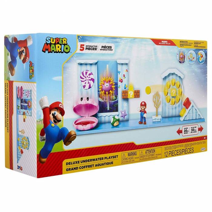 Το υποβρύχιο σετ παιχνιδιού σας δίνει τη δυνατότητα να επαναλάβετε αυτό το κλασικό επίπεδο του παιχνιδιού Super Mario. Μπορείτε να αναδημιουργήσετε το παιχνίδι με τον Mario, περιηγώντας τον μέσα από διάφορα εμπόδια. Περιλαμβάνονται σε αυτό το σετ παιχνιδιού τρία διαδραστικά περιβάλλοντα με διάφορους μηχανισμούς. Το εργοστάσιο νερού περιστρέφεται, υπάρχει ένα κρυμμένο νόμισμα που βγαίνει από μια το μπλοκ με το ερωτηματικό και μπορείτε να μετακινήσετε το Blooper από το νερό. Μπορείτε ακόμη και να αλλάξετε σκηνικό αλλάζοντας θέση τον ύφαλο και το πιτσίλισμα νερού σύμφωνα με τις προτιμήσεις σας. Ξεκινήστε να δημιουργείτε το δικό σας Super Mario World με αυτό το deluxe σετ παιχνιδιού.