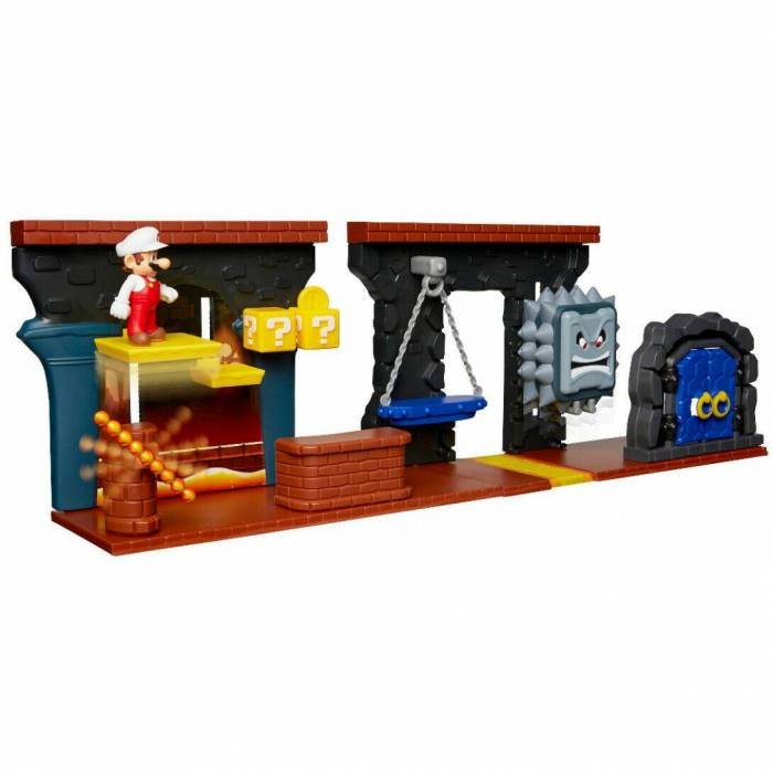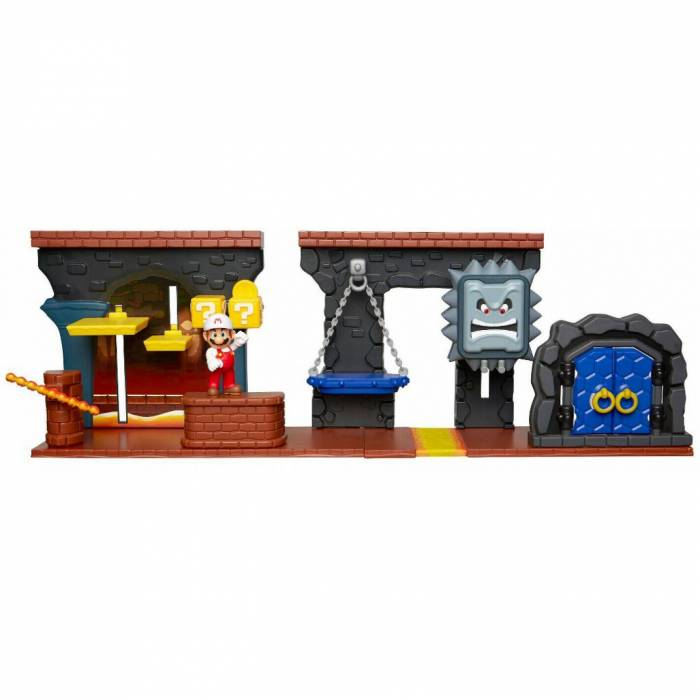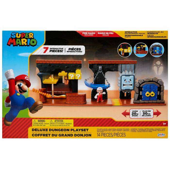 Το Super Mario Deluxe Dungeon σετ παιχνιδιού σας δίνει τη δυνατότητα να επαναλάβετε αυτό το κλασικό επίπεδο του παιχνιδιού Super Mario. Μπορείτε να αναδημιουργήσετε το παιχνίδι με τον Mario, περιηγώντας τον μέσα από διάφορα εμπόδια. Περιλαμβάνονται σε αυτό το σετ παιχνιδιού 7 διαδραστικά περιβάλλοντα με διάφορους μηχανισμούς. Μπορείτε ακόμη και να αλλάξετε σκηνικό αλλάζοντας θέση τον πύργο, την πλατφόρμα από τούβλα και την πύλη σύμφωνα με τις προτιμήσεις σας. Ξεκινήστε να δημιουργείτε το δικό σας Super Mario World με αυτό το deluxe σετ παιχνιδιού.