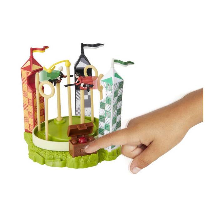 Αναδημιουργήστε της αγαπημένες σας ιστορίες από το μαγικό κόσμο του Harry Potter με το σετ παιχνιδιού Γήπεδο Quidditch. Το σετ περιλαβάνει φιγούρες του Harry και του Drago πάνω στα σκουπόξυλά τους. Κάντε τους να στριφογυρίσουν γύρω στο γήπεδο κυνηγώντας τη χρυσή μπάλα. Ανοίξτε το σεντούκι για να δείτε και τις υπόλοιπες μπάλες. Ποιός θα κερδίσει αυτό το επικό ματς μεταξύ Gryffindor και Slytherin?