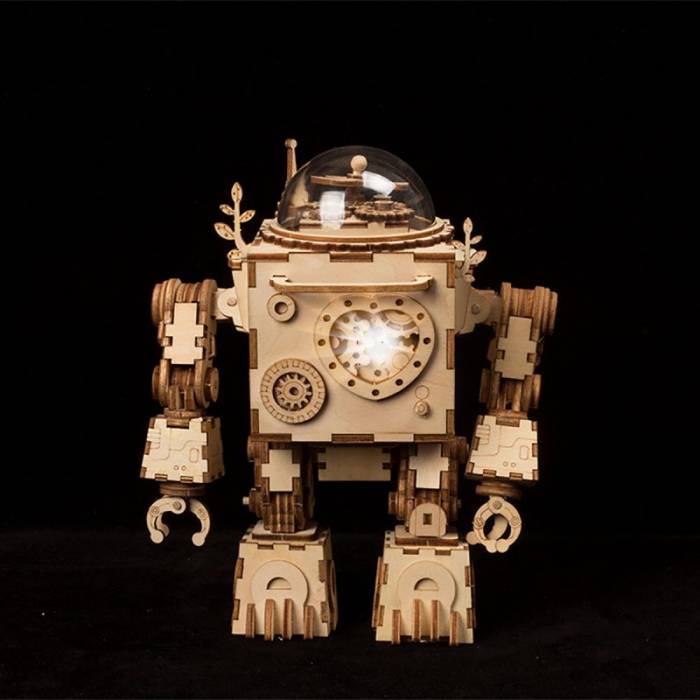 Κουτί μουσικής σε σχήμα ρομπότ σε μηχανικό στιλ steampunk. Η καρδιά του μπορεί να λάμψει μετά την ενεργοποίηση. Η φυσική υφή του ξύλου και οι ζωηρές λεπτομέρειες το καθιστούν ένα μοναδικό δώρο και ένα υπέροχο χόμπι για όλες τις ηλικίες.