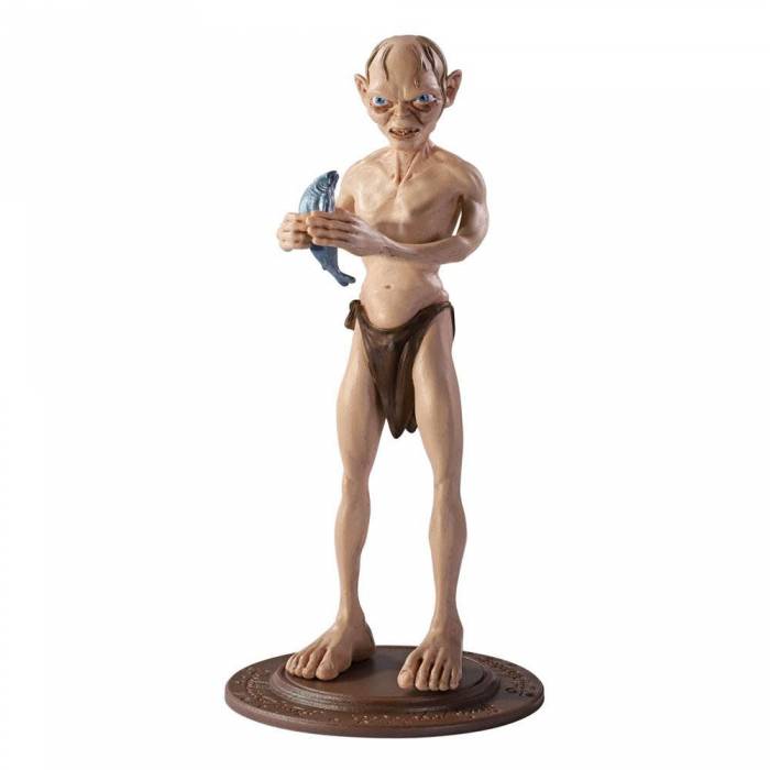 This Gollum fully posable figure stands approximately 7.5 inches in height and comes on a circular stand emblazoned with the Ring rhyme and with accessories such as Gollum’s fish.