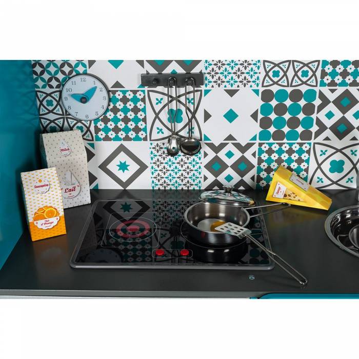 15 αξεσουάρ. Ετοίμασε νόστιμους μεζέδες για τους φίλους σου, όπως κάνουν η μαμά κι ο μπαμπάς σου, και γίνε ένας Μικρός Σεφ!!! Η κουζίνα Lagoon Maxi είναι φτιαγμένη από ξύλο και διαθέτει μια σειρά πιαστράκια για να κρεμάς 3 μεταλλικές κουτάλες, 1 μεταλλική κατσαρόλα με το καπάκι της, 1 μεταλλικό σουρωτήρι, 1 γάντι κουζίνας, 1 τηγανητό αυγό και 7 χαρτονένιες συσκευασίες τροφίμων (κακάο, ζάχαρη, χυμός πορτοκάλι, μακαρόνια, τυρί, γάλα και ρύζι). Όπως μια αληθινή κουζίνα, έχει εστίες με φωτάκια LED και ηχητικά εφέ: πάτησε μία φορά τα κόκκινα κουμπιά για να δεις τις κυκλικές εστίες να ανάβουν και άλλη μία φορά για να ακούσεις το νερό να βράζει. Ο ήχος σταματά και τα φωτάκια σβήνουν ύστερα από 30 δευτερόλεπτα ή αν πατήσεις τα κόκκινα κουμπιά για τρίτη φορά. Αυτή η φανταστική, πλήρως εξοπλισμένη κουζίνα διαθέτει επίσης φούρνο, φούρνο μικροκυμάτων, ντουλάπι και ψυγείο με μαγνητικές πόρτες, 3 κουμπιά με ηχητικά εφέ, νεροχύτη από ανοξείδωτο ατσάλι, ρολόι και μαυροπίνακα. Ύψος πάγκου κουζίνας: 57 εκ. Λειτουργεί με 2 αλκαλικές μπαταρίες LR6 – 1,5V (δεν περιλαμβάνονται). Παραδίδεται μη συναρμολογημένη. Ξύλο: ινοσανίδα MDF (βαμμένα κομμάτια) και κόντρα πλακέ (άβαφα κομμάτια). Κλειστό χρωματιστό κουτί με άκρες από πολυεστέρα.