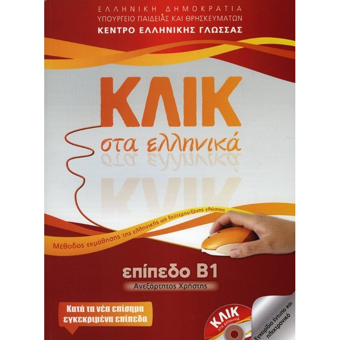 Μέθοδος εκμάθησης της ελληνικής ως δεύτερης/ξένης γλώσσας. Βασίζεται στο Νέο Αναλυτικό Εξεταστικό Πρόγραμμα, εφαρμόζει τις αρχές τις σύγχρονης διδακτικής και καλλιεργεί όλες τις δεξιότητες. Προετοιμάζει ευχάριστα και αποτελεσματικά τους υποψήφιους των εξετάσεων για την Πιστοποίηση Επάρκειας της Ελληνομάθειας στο επίπεδο Β1 θέτοντας στέρεες βάσεις για τα επόμενα επίπεδα. Καινοτομεί παρέχοντας στους χρήστες πρόσβαση στο ηλεκτρονικό "Κλικ στα ελληνικά