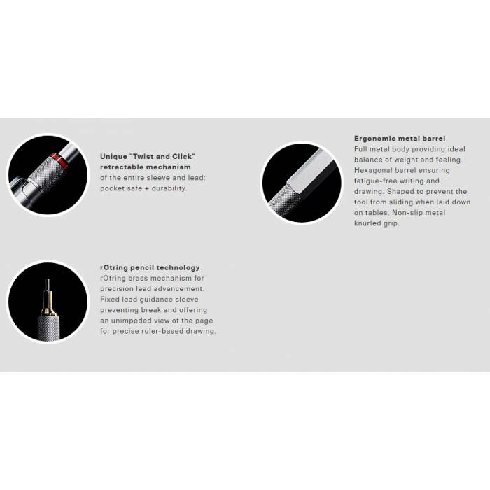• Fixed lead guidance sleeve preventing break and offering an unimpeded view of the page for precise ruler-based drawing